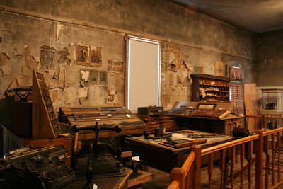 On the main floor we toured the pressroom, which contains much of the original equipment: presses, typewriters, desks and cases that hold lead letters for creating print. Dozens of antique documents cover the walls, including handbills, advertising posters and almost any other ephemeral reading matter a small town might need. Like most newspapers of the day, the Sentinel was also in the job-printing business.