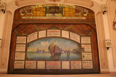 Upon entering the opera house, the first thing that catches your eye is the colorful 1924 stage curtain, painted with a scene of some far-away harbor, surrounded by advertisements for local businesses. This kind of drape is called an oleo; Eureka's burned in 1924 and the cost of replacing it was offset by selling advertising on it, a practice that was not unique to Eureka. The businesses represented on today's curtain are those who bought ads nearly 85 years ago. "