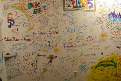 Performers sign their names in colorful ink and marker on walls in the backstage stairwell and throughout the downstairs area that is used by performers and crew.
