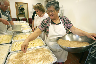 Filled pans are moved to a table across the room, where more volunteers wait. Kourlos may be 83 years old, but she works fast. Soon the filled pans are backing up on her table. Time for Koutsulis to step in.