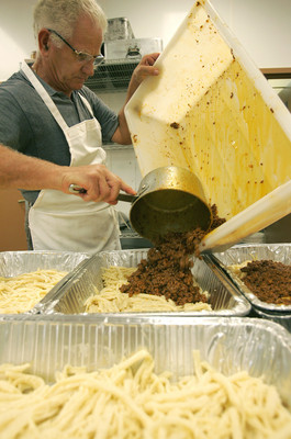 Most of the time, the volunteers work smoothly, with little conversation. But at one point Kourlos pauses, the macaroni in her hands dangling over the tub, as she views a minor skirmish in the saucing area.
