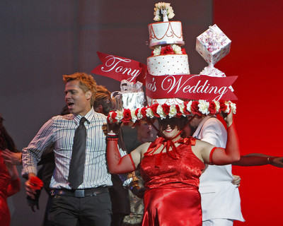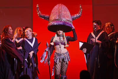 "Phantom" performers dressed as choir members and sang Queen's "Bohemian Rhapsody." Toward the end of the song, a woman appeared wearing a giant sequined Viking helmet bonnet, a la Bugs Bunny in "What's Opera, Doc?" She fake-stabbed a singer with her spear to vigorous applause.