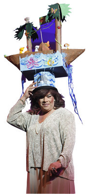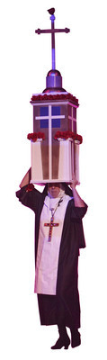 Looking every bit like a nun balancing part of a hospital on her head, Ivanoff strode onstage, hands firmly on bonnet and mind focused on staying upright. The wood and rose-covered tower was a bit top-heavy, Ivanoff said, and he tried it on for the first time only that morning.