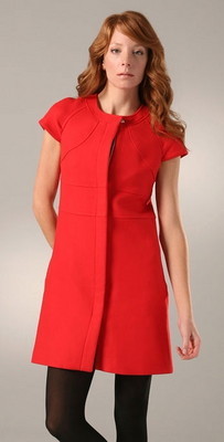 Mendes starts with a tomato-red frock with very little shape. She relies on the eye-catching color, not a sexy cut, to inject the pop. The button details on the chest and pleat down the center convey an innocent, schoolgirl tone.