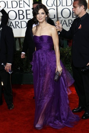 Sandra Bullock: This purple Bottega Veneta confection worked wonders for Bullock. The transparent skirt, ruched bodice, naked neckline, drop earrings and cascading curls are enough to forgive the bleached big hair look for which she won a Golden Globe.