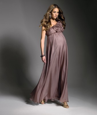 A night out on the town just isn't the same when you're a month shy of giving birth. Somehow the whole glamorous thing can get lost -- if you let it. Why not make the most of the one time in your life that you don't have to bother camouflaging your tummy? Go all out with a gown that turns heads while putting your proud moment in the spotlight. One shoulder silk gown with rosette detail in mink, $495, A Pea in the Pod