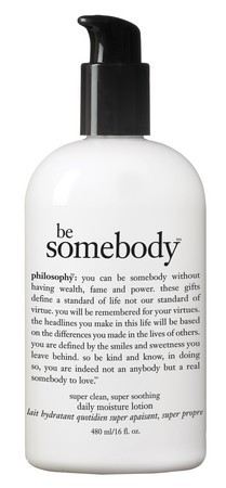 The folks at philosophy know you start your day with a good lotion lather. With a little help from its new line, be somebody, you can start your day off with a little inspiration, too. With green tea, olive fruit oils and shea butter, the lotion moisturizes and replenishes skin while the packaging encourages you to feel good, be good and become somebody to everybody. Philosophy be somebody super clean super soothing daily moisture lotion, $24, Nordstrom