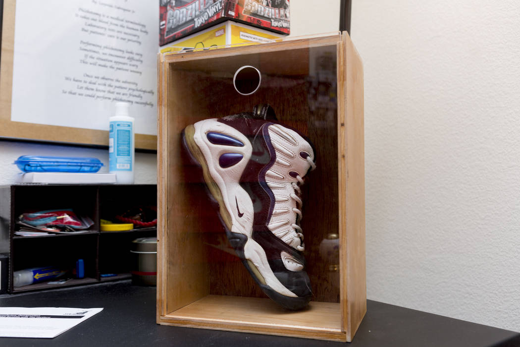 “This is an adult-size model of the shoe I was wearing when I was in kindergarten,” he says. “They are called black and white Air Jordan 14s, and my dad got these for me when I was like 5.”