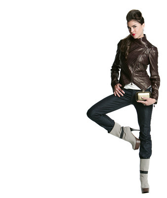 Alexander McQueen studded leather jacket, $5,995, Outfit at Wynn Las Vegas; Rock 'n' Republic whiskey blue and copper skinny jeans, $295, Mojitos at Wynn Las Vegas; Balichi half-sleeve gauze T-shirt, $45, balichi.com; Alexander McQueen skull clutch, $1,010, and Marni Stivale boot, $840, both available at Neiman Marcus