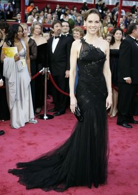 • Hilary Swank: So many black dresses on the red carpet almost made me take a nap. Boring. But Swank found a black gown that actually made her stand out from the others. The asymmetrical Versace gown fit her exquisitely, and the beaded flower details gave the dress a lot of personality.
