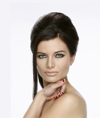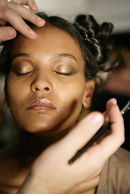 Since the focus is the eyes, Montoya used a nude liner in flesh and an almost-white lipstick cream on Radeva's lips. A flesh-toned cream blush with a mauve undertone completes the look.