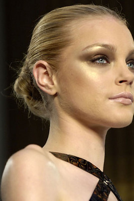 For this look, makeup artist Chris Montoya from Tonic Salon started with a golden waterproof pencil all over the eyelid. "It makes the color more intense." Then he added a layer of shimmery gold eye shadow on top. Montoya used a black eye liner and then buffed out the color with a bronze eye shadow.