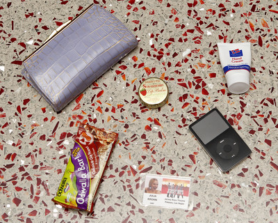 • What's in your handbag? Clockwise from top: Rosebug Strawberry lip balm, Neutrogena hand cream, iPod, "Jersey Boys" ID card, Odwalla bar and purple leather wallet.