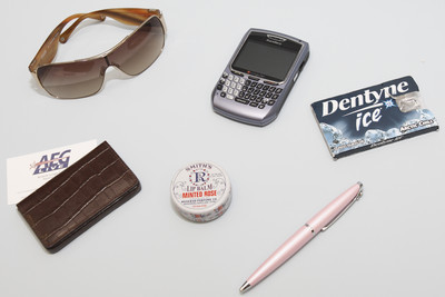 • What's in your handbag? Clockwise from top: BlackBerry, Dentyne Ice Arctic Chill gum, Cross pen for breast cancer, Smith's minted rose lip balm, Neiman Marcus business card holder and Coach sunglasses.