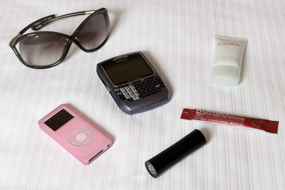 • What's in your handbag? Clockwise from top right: Everything! My La Mer hand cream. I'm on airplanes every week and airplane air dries you out, so I keep a bottle of water in my bag with my Borba powder. It comes in little packets that look like Splenda but they are pomegranate flavored and full of anti-oxidants. It keeps the skin looking great. Armani nude lipstick, it's glamourous and subtle all at once. My pink iPod, because music feeds my soul and I like to keep it handy in case I have time to sqeeze in an extra workout. My sunglasses, because there's a lot of sunshine here on the Strip. Finally, my BlackBerry, because it works everywhere in the world, and I just never know when Mr. Trump might be calling to ask a question.