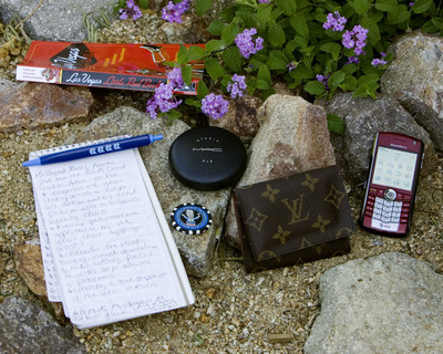 • What's in your bag? Items clockwise from top: MAC Powder, BlackBerry, Louis Vuitton business card case, good luck poker chip from Mayor Oscar Goodman, reporter notebook with pen and "Las Vegas Little Red Book."