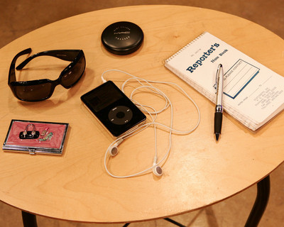 • What's in your handbag? Clockwise from top: MAC powder, reporter's notebook, pen, iPod, business card holder from Stone Mart and Nine West sunglasses.