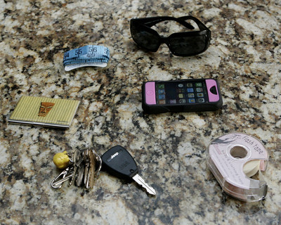 • What's in your handbag? Clockwise from top: Chanel sunglasses, iPhone, flash tape for body and clothing, keys with Tarina Tarantino Hello Kitty, Shag business card holder and a tape measure.