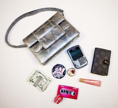 • What's in your handbag? Clockwise from top: My BlackBerry, Mini Louis Vuitton Day Planner, Sweet Talk lip gloss, Orbit Cinnamon Chewing Gum, Cherry Now and Later Candy, Tiffany money clip engraved "fabulousness" holding some cash, hummingbird hand mirror and rose lip moisturizer compact.