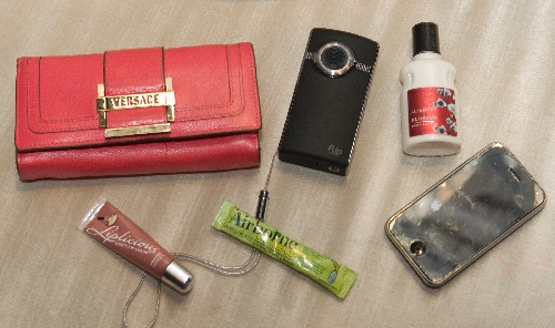 What's in your bag? Flip camcorder, lotion, iPhone, Airborne On-the-Go lip gloss, Versace wallet.