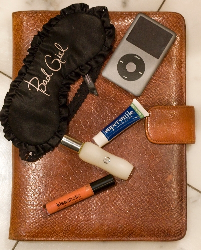 • What's in your bag? Notebook, iPod, Supersmile brushless toothpaste, If perfume oil (yummy!), Kissaholic lip gloss (need I say more?), sleep mask.