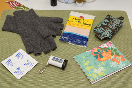 • What's in your bag? 1. Moleskin Foam Padding, 2. Reusable grocery bag, 3. Blank cards, 4. Flashlight, 5. Lactaid lactase enzyme supplement, 6. Fingerless gloves.