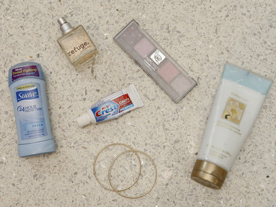 • What's in your handbag? 1. Color Concepts eyeshadow, 2. Victoria's Secret Endless Love body cream, 3. Gold bangles, 4. Kid's Crest toothpaste, 5. Suave deodorant, 6. Refuge perfume