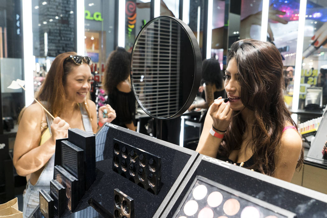 Jane Acero, left, browses MAC’s selection while friend Michelle Lazo tries on some lipstick for National Lipstick Day at the Miracle Mile Shops in Las Vegas, Sunday, July 29, 2018. (Marcus Villagran/Las Vegas Review-Journal) @brokejournalist