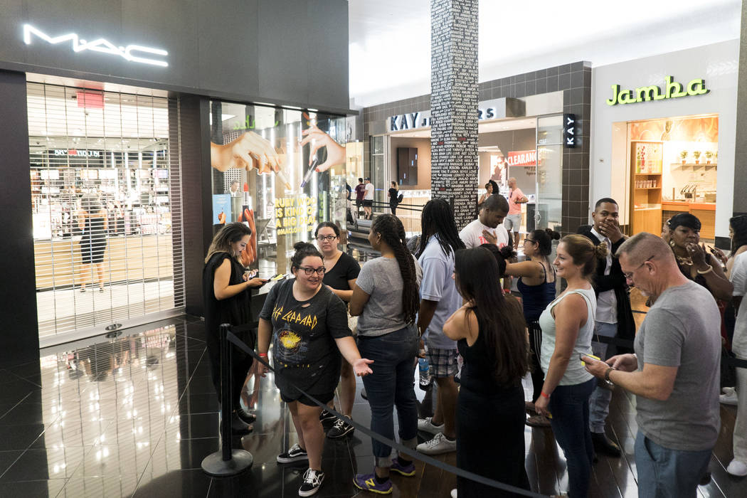 The line for free lipstick outside of MAC Cosmetics at the Miracle Mile Shops for National Lipstick Day in Las Vegas, Sunday, July 29, 2018. (Marcus Villagran/Las Vegas Review-Journal) @brokejournalist