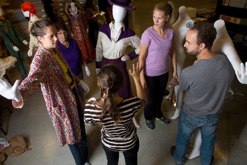 Such as a slender mannequin that can’t fully occupy the fringed dress of Liz Renay, the late burlesque dancer. Student Alex Clay Hutchings performs emergency breast enhancement using pillow stuffing and nylon stockings to fix that problem. Va va and voom.
