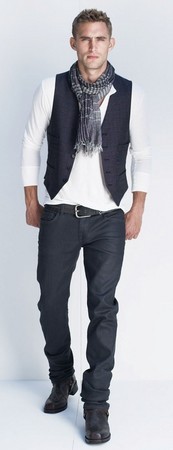 2. Dark denim boot cut jean. Boot cut for men merely implies room for your Chelsea boots. Skinny, but not too skinny.