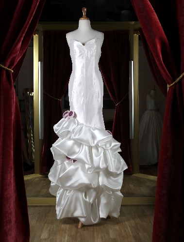 She imports some fabrics from Italy and France and uses crystals that she says are on par with Swarovski's. Between materials and construction, her price points climb much higher than your David's Bridal or Alfred Angelo stores.