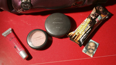 • What's in your bag? Wet 'n' Wild lip gloss, MAC blush in mocha, MAC Studio Fix foundation, Pure Protein protein bar, my favorite picture of my dad (he passed away in '03).
