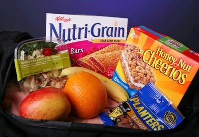 Her suggestions include Nutri-Grain cereal bars, Honey-Nut Cheerios Milk 'n Cereal Bars, cheese and crackers, bar cookies such as Fig Newtons, fruit (including frozen grapes) or string cheese. Some of these items are more easily crushed than others, she noted, so your choices should be influenced by how well you can pack them.