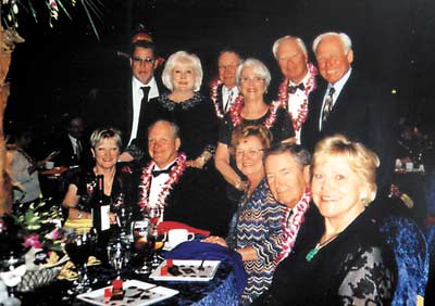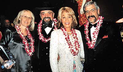 This year's gala featured a Hawaiian theme. Orchid leis were given at the party's entrance and colorful Hawaiian florals were displayed throughout the reception's silent auction and dining room, where Hawaiian dancers performed and the dining tables boasted centerpieces of feathered parrots.