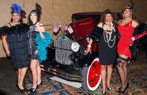 The majority of the 324 guests donned clothes of the Gatsby era for the star-studded event. The reception took place among vintage cars loaned from Pam and Tony Gardner, Cathy and Art Schieff and Bob Taylor.