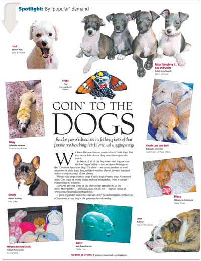 In honor of all of the dog-lovers and dogs across the Las Vegas Valley -- and in a loose homage to the "Greatest American Dog" TV show -- we asked readers to send us photos of their dogs. Boy, did they send us photos. Several hundred readers sent us a total of 498 photos.