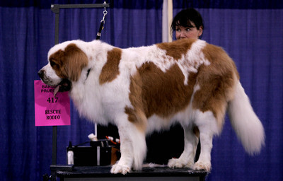 The winner is Barbara Prueckel from Calgary, Alberta. Her dog, a St. Bernard named Moe delivered by the Henderson Animal Shelter, is 150 pounds and required another groomer just to heave onto the table.