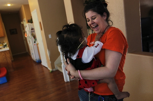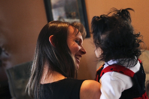 "Oh, my, you do want to be held, don't you?" laughs Brittney Quirk, picking up the child to hug and kiss.