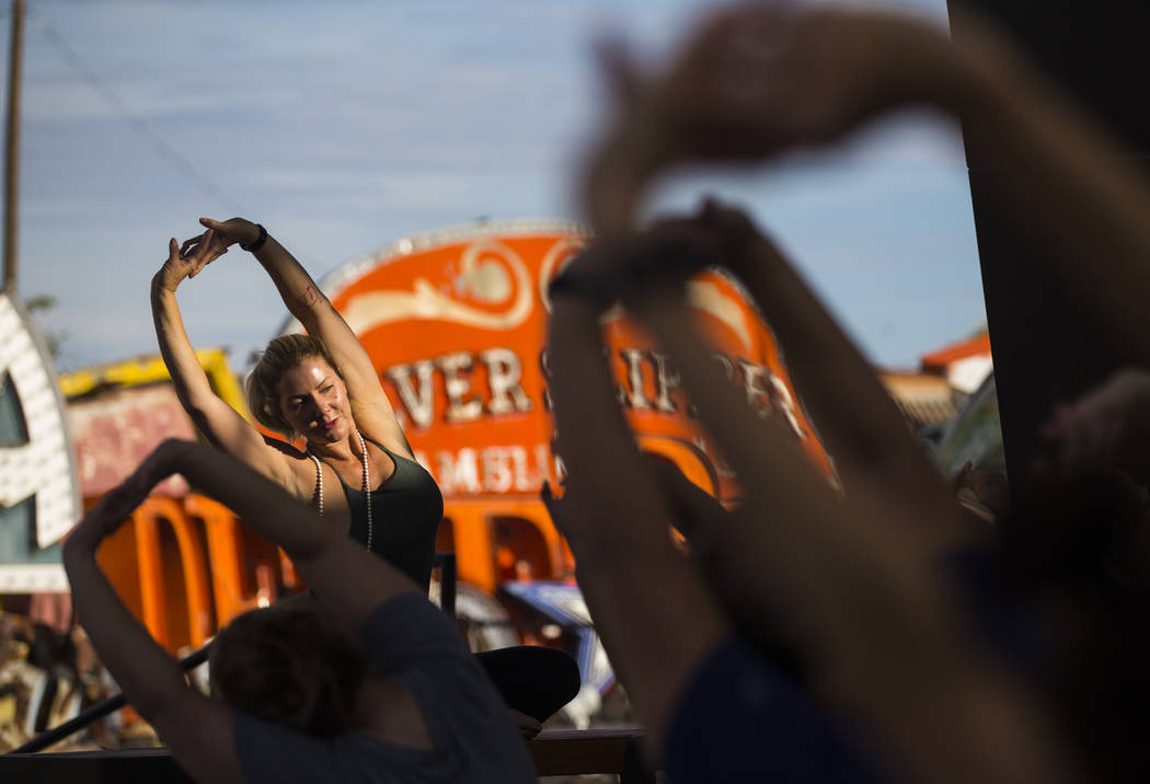 Yoga instructor Eileen Lorraine leads a hot yoga session in the outdoor Neon Boneyard area at the Neon Museum in Las Vegas on Wednesday, July 19, 2017. Three more one-hour sessions are slated to take places on Wednesdays including Aug. 2, Aug. 16, and Aug. 30. Chase Stevens Las Vegas Review-Journal @csstevensphoto