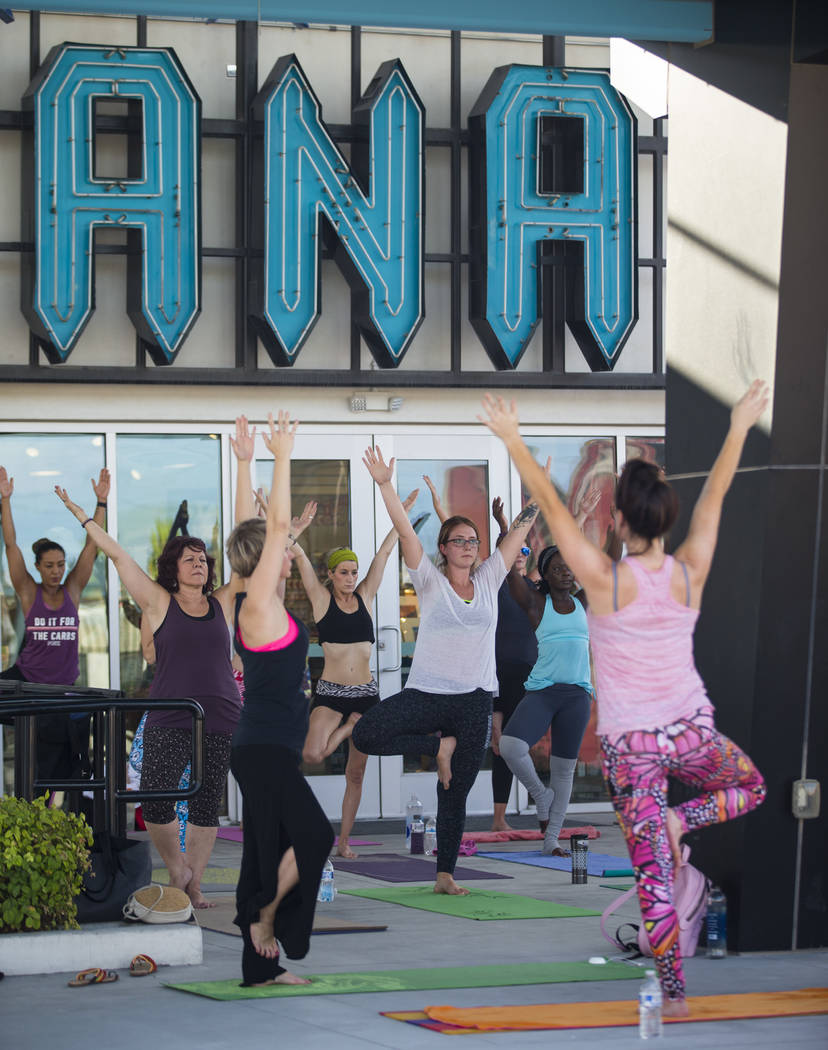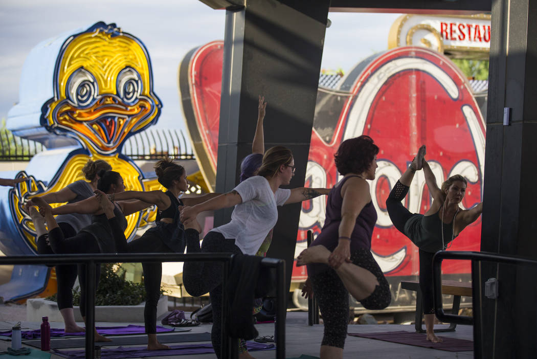 Yoga instructor Eileen Lorraine, far right, leads a hot yoga session in the outdoor Neon Boneyard area at the Neon Museum in Las Vegas on Wednesday, July 19, 2017. Three more one-hour sessions are slated to take places on Wednesdays including Aug. 2, Aug. 16, and Aug. 30. Chase Stevens Las Vegas Review-Journal @csstevensphoto