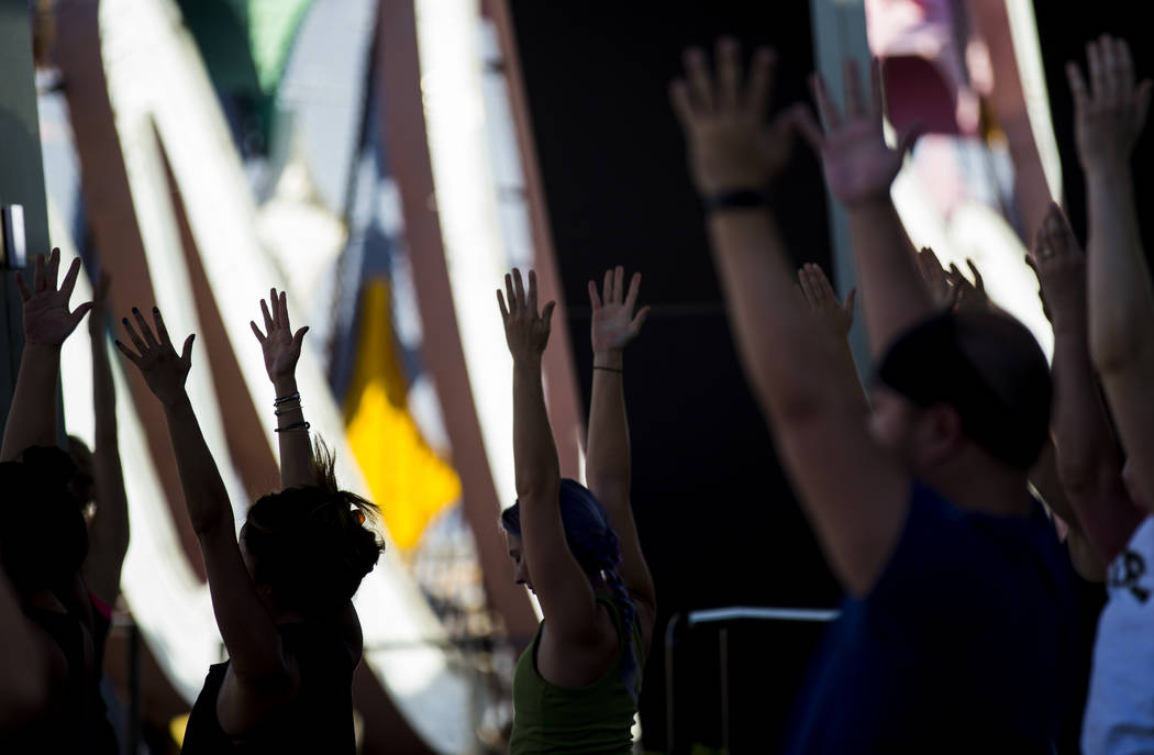 People participate in a hot yoga session in the outdoor Neon Boneyard area at the Neon Museum in Las Vegas on Wednesday, July 19, 2017. Three more one-hour sessions are slated to take places on Wednesdays including Aug. 2, Aug. 16, and Aug. 30. Chase Stevens Las Vegas Review-Journal @csstevensphoto