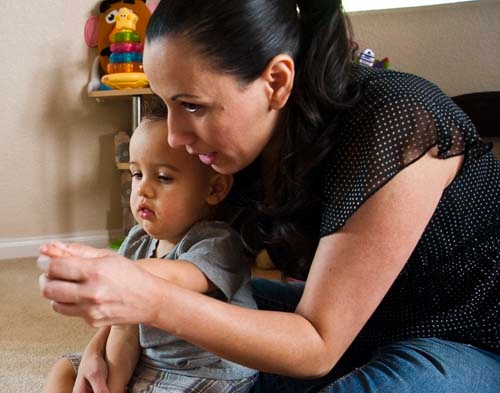 It's early Wednesday morning at the Szott's home in Las Vegas, and Easter Seals child development specialist David is engaged in serious play in their living room -- activities designed to help Gianni with his motor skills.