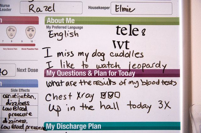■ Dry erase boards in patient rooms: The boards have information about the health care providers assigned for that shift, and some identify exactly how the patient wants to be called.