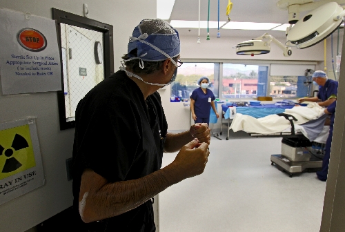It is just before 7 o'clock Wednesday morning as Dr. Kevin Petersen scrubs for a hernia operation at Medical District Surgery Center. Just another day for the surgeon who has become best known in Las Vegas for offering low-cost, cash-only surgeries to uninsured patients, most of whom come from out of town.