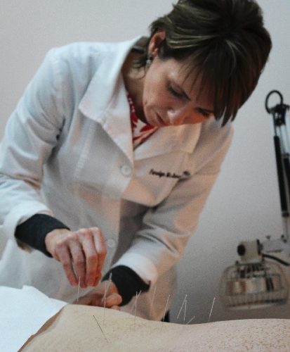 To the accompaniment of traditional Chinese music —- a mellow sound designed by its composer as a gentle brain massage —- Dr. Farolyn McSweeney stuck needles with her bare right hand into Joseph Wines’ back.