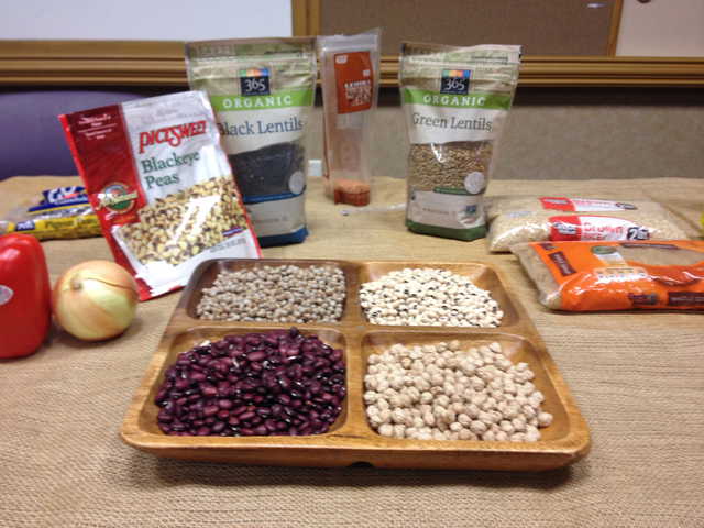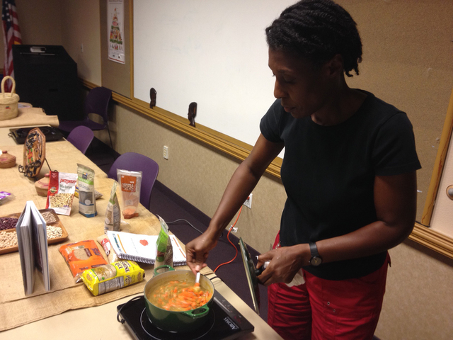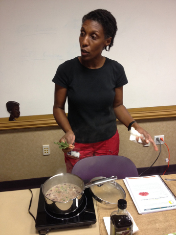 A class of 10 people listens intently to registered dietitian Karen Petersen as she demonstrates how to cook red lentils and Caribbean coconut red beans. She briefly explains the African origins of the dishes in an effort to connect participants to their traditional food.