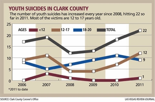 Joe Miller, a sophomore at Silverado High School, was one of 19 suicides in 2007 among local youths, ranging in age from preteen to 20 years, according to the Clark County Coroner’s Office. The number of youth suicides went down in 2008 but has been on the rise every year since. This year, 22 suicides have already been reported for youths, a tally of grief that puts Clark County’s youth suicide rate at 2.33 per 100,000 children, almost double the national rate of 1.3.