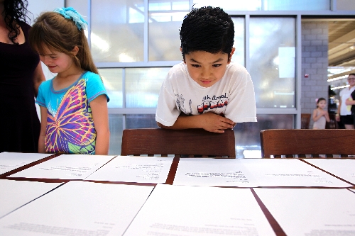 On Tuesday at the Paseo Verde Library, Assemblyman Lynn Stewart, R-Henderson, met with two public school teachers, Jackie Ayala and Mark Lyons, who have worked to bring Nevada’s cancer donation law to fruition. They looked over letters from school children urging pharmacists to join the program.