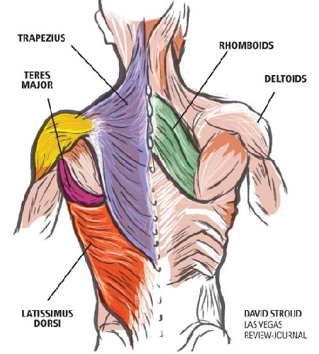 The latissimus dorsi of the upper back tend to pop like wings when they are well developed.